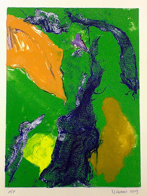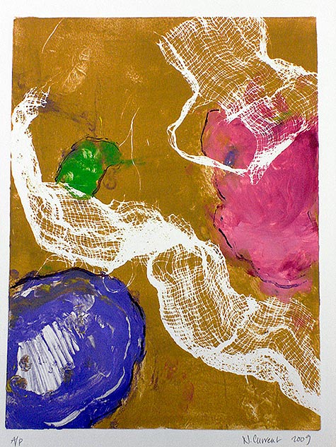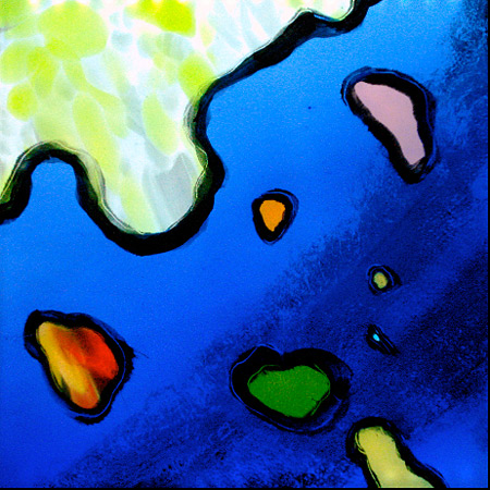 “Numerous Islands Will Be Glad” is a series whose subject is a joyful spirituality and appreciation of life. The title comes from the first line of Psalm 97: “The Lord is King, the world will rejoice, numerous islands will be glad.” Works in this series use a common imagery of varied “island” shapes, and emphasize the ability of paint, color and light to communicate a spirit of joy and thankfulness. The artist explores this theme in the mediums of both painted glass and printmaking.